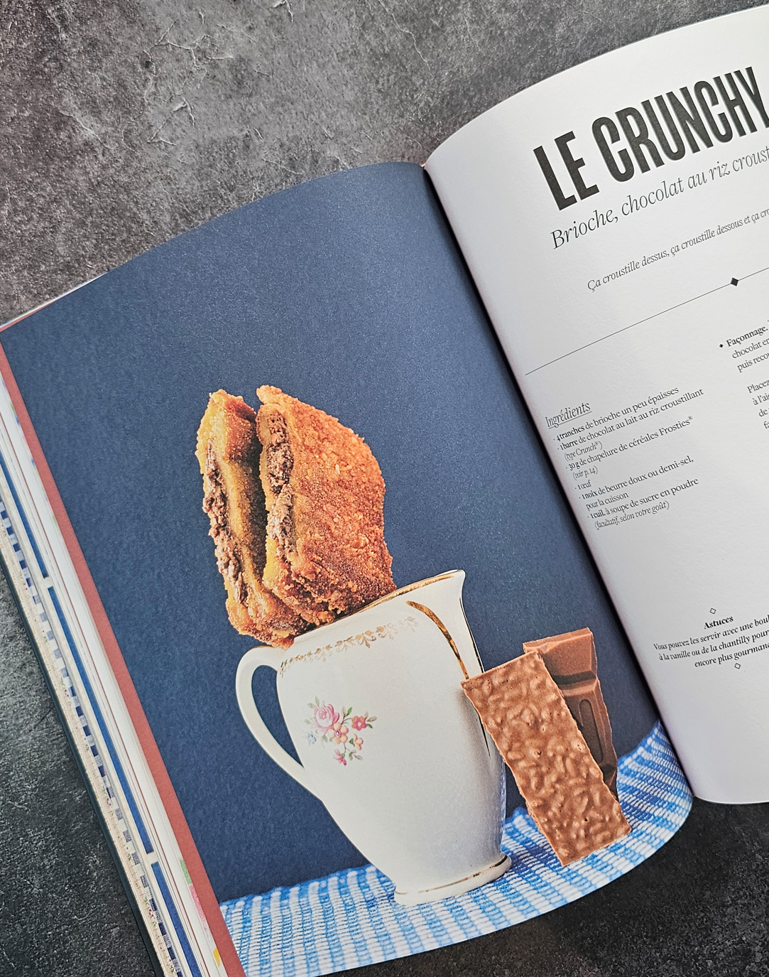 Une brioche épaisse garnie de chocolat croustillant au riz soufflé, panée puis frite comme un cordon-bleu. Un dessert régressif, complètement décalé, dont le contraste moelleux–croustillant fonctionne à merveille. L’un des visuels les plus irrésistibles du livre.